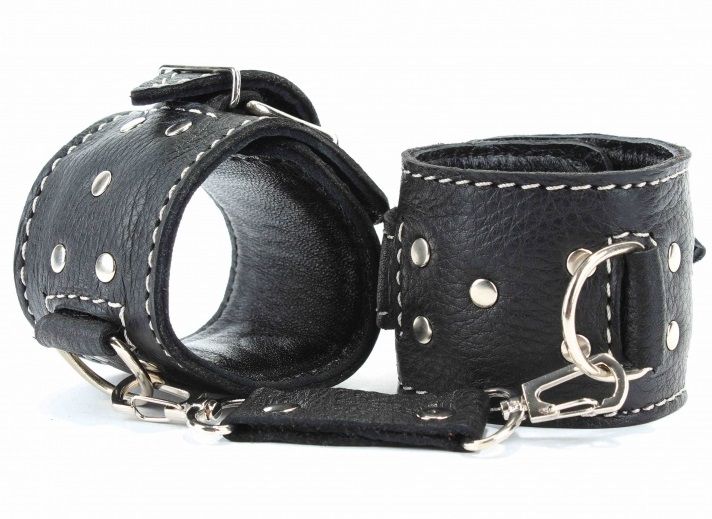 Чёрные кожаные оковы с крупной строчкой.