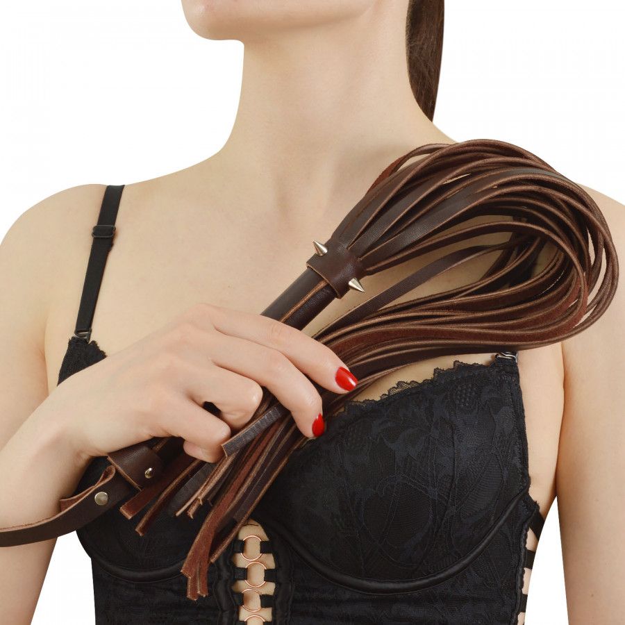 Плеть изготовлена из натуральной кожи коричневого цвета и украшена тремя металлическими шипами.