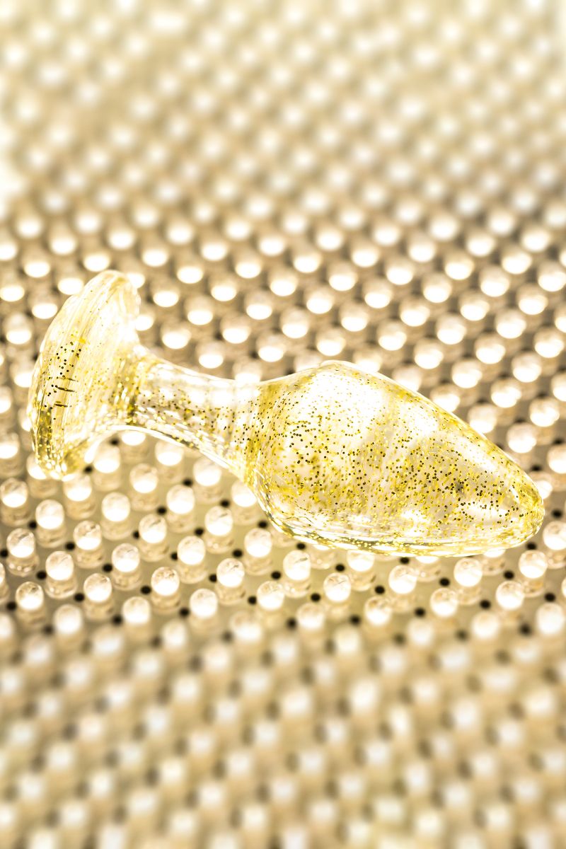 Анальная втулка классической формы выполнена из акрила. Прозрачный материал с золотистыми блестками внутри. Ограничительное основание обеспечивает безопасность при использовании, поэтому втулку высоко ценят не только опытные любители анального секса, но и новички. Рабочая длина - 6,5 см.